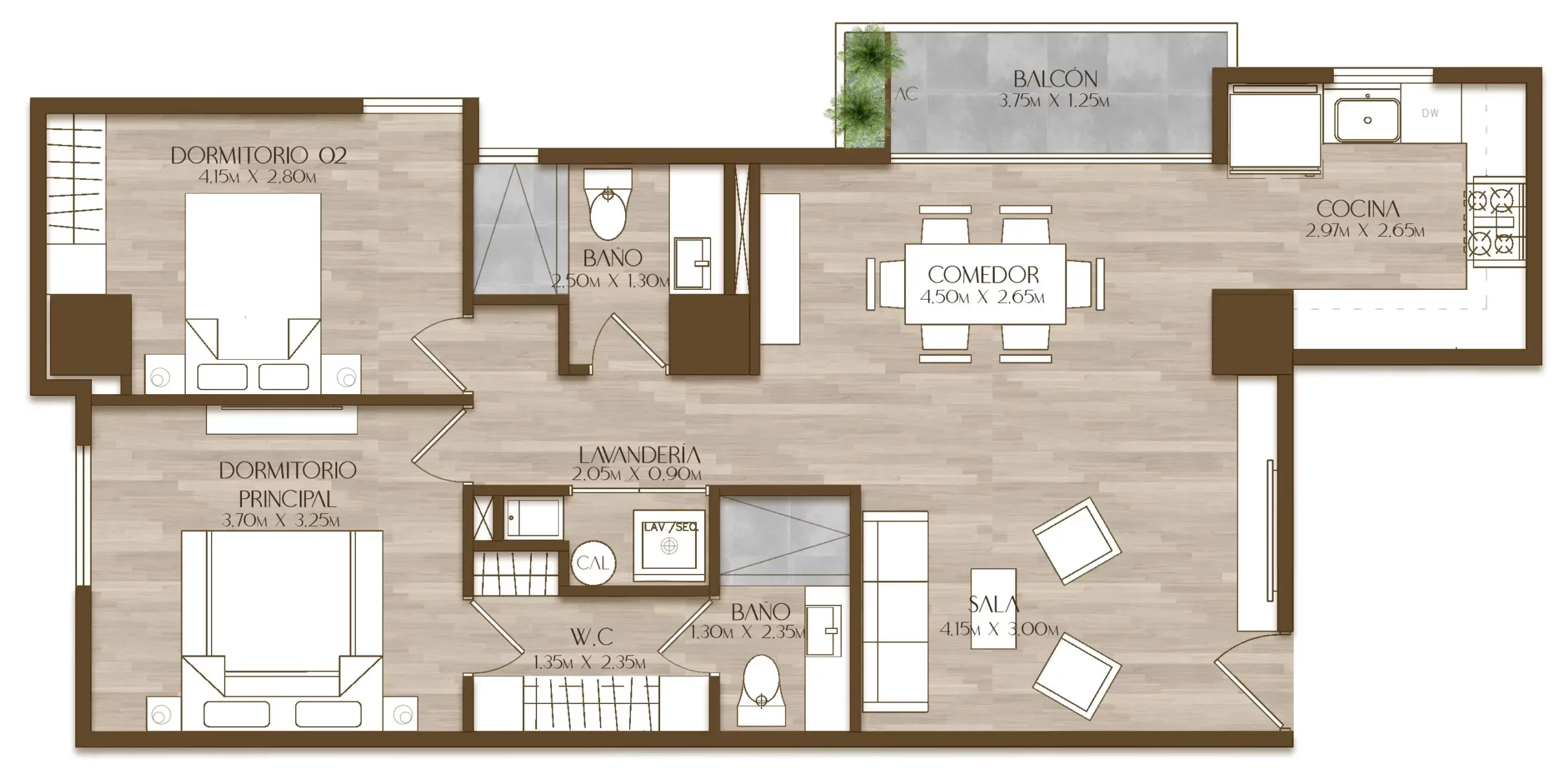 2 dormitorios2 bañosbalcónlavanderíacomedorsalacocina