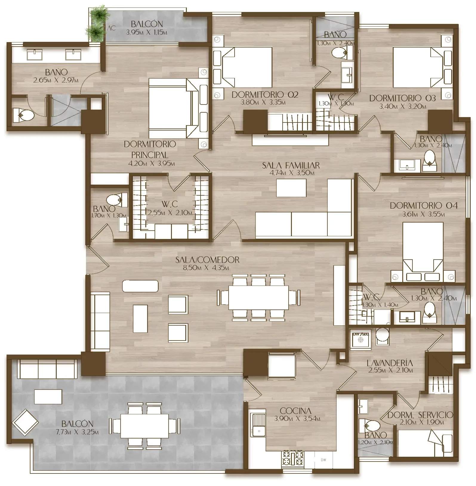 4 dormitoriosdormitorio de servicio5.5 bañoslavanderíacomedorsalasala familiarcocina