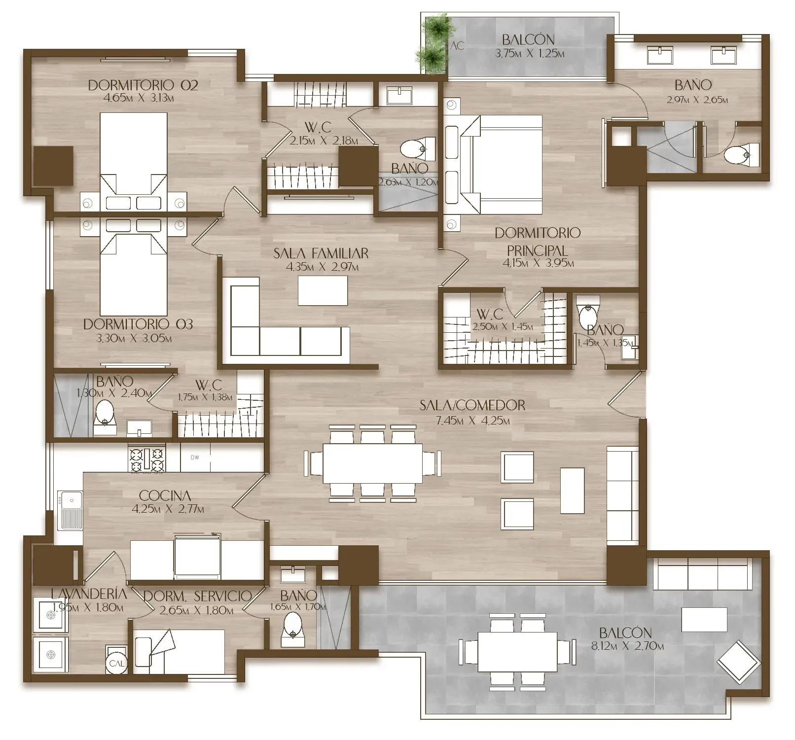 3 dormitoriosdormitorio de servicio4.5 baños2 balconeslavanderíacomedorsalasala familiarcocina